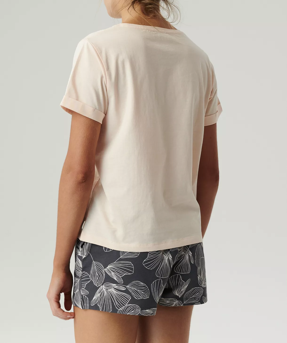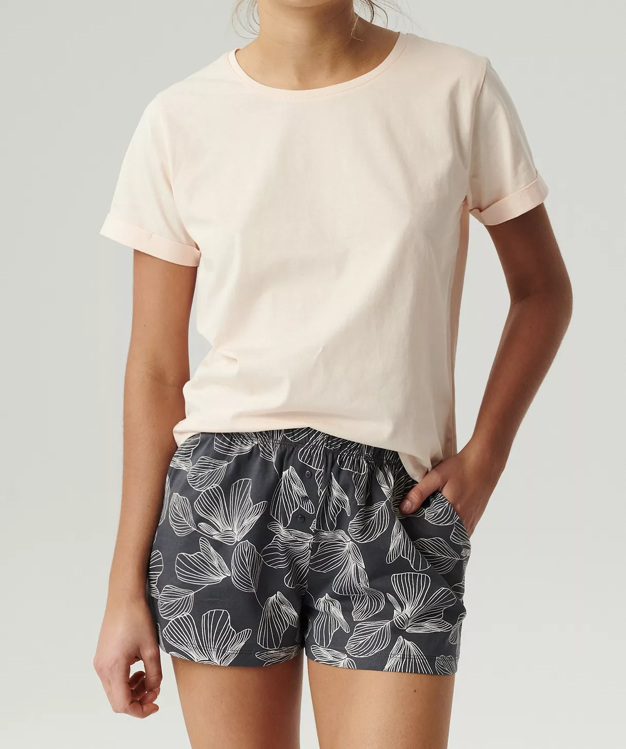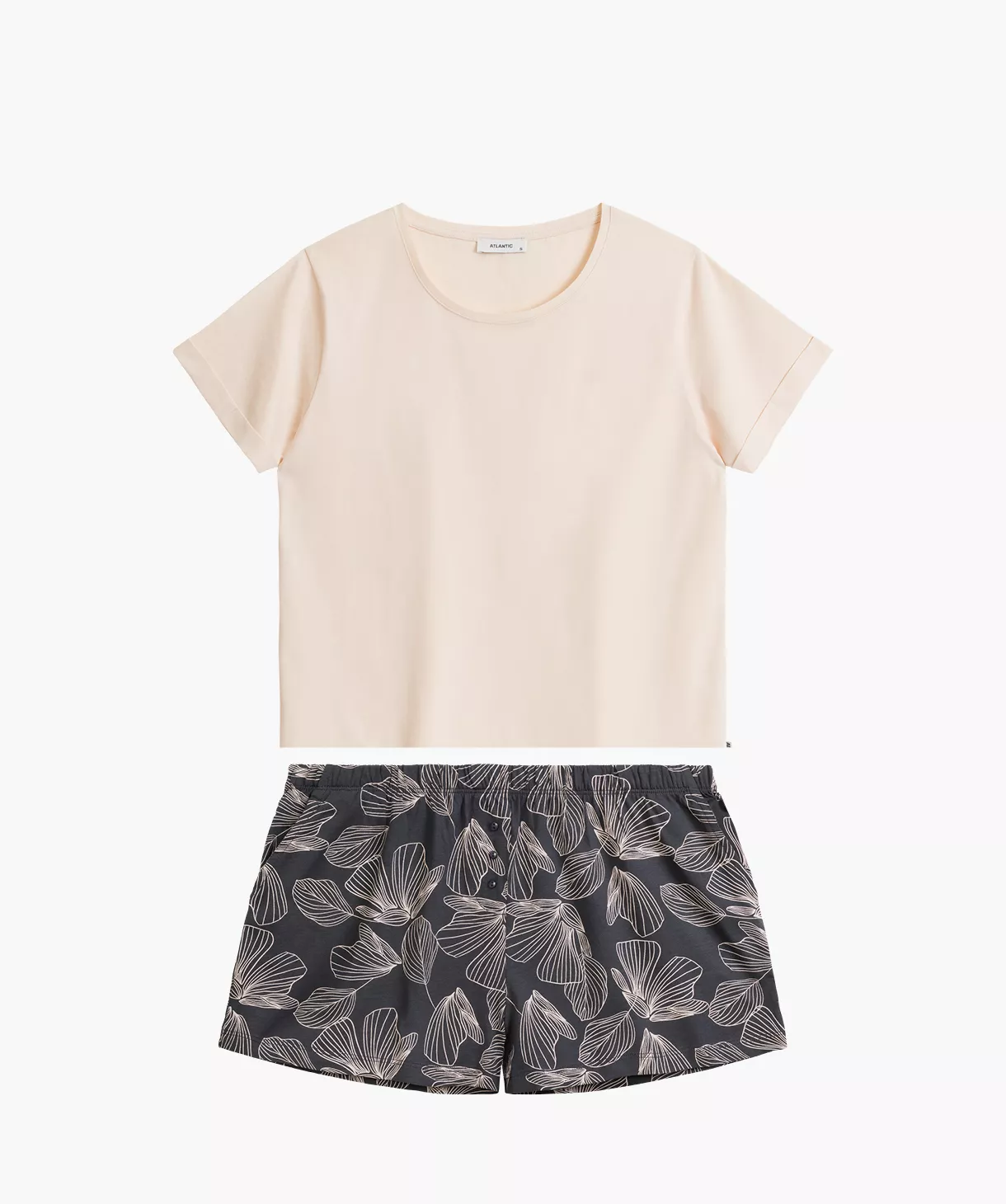 Piżama damska Atlantic z krótkim rękawem wykonana z miękkiej w dotyku bawełny. Koszulka w pudrowym kolorze z krótkim rękawem. Spodenki krótkie, wzorzyste, w pasie elastyczna gumka. Po bokach kieszonki.