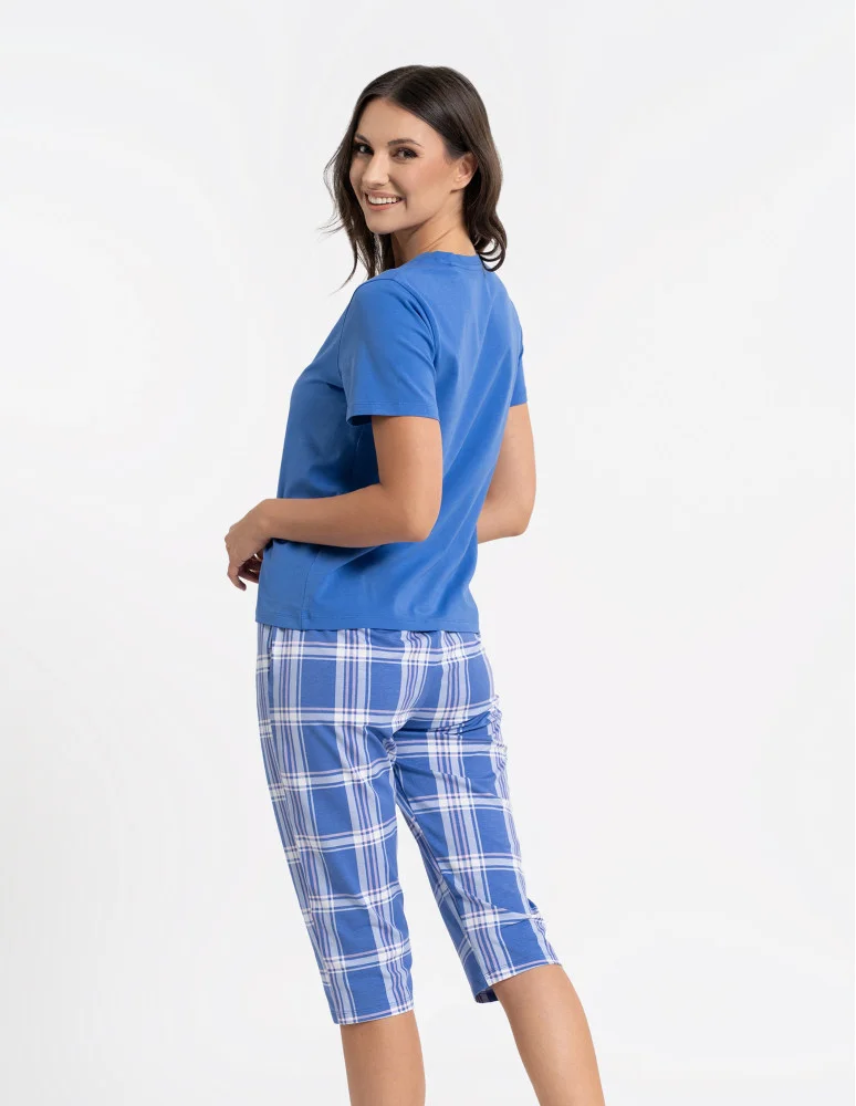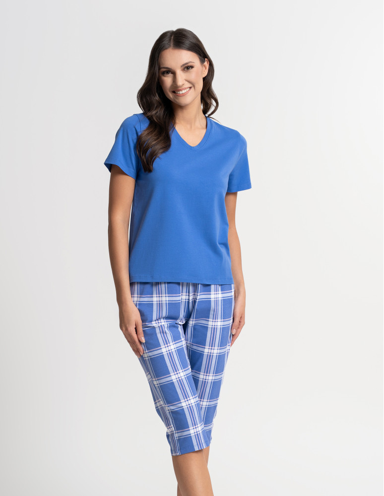 Piżama damska PDD3600-005 stanowi klasyczny model ze spodniami o długości 3/4 zapewniający wygodę i funkcjonalność. Góra piżamy to jednolita, gładka koszulka w kolorze niebieskim, dekolt w serek. Do kompletu spodnie wzorowane w biało-różową kratę na niebieskim tle, w pasie elastyczna guma zapewniająca swobodę ruchów, po bokach wygodne, głębokie kieszenie zwiększające funkcjonalność piżamy która może stanowić komplet całodzienny.