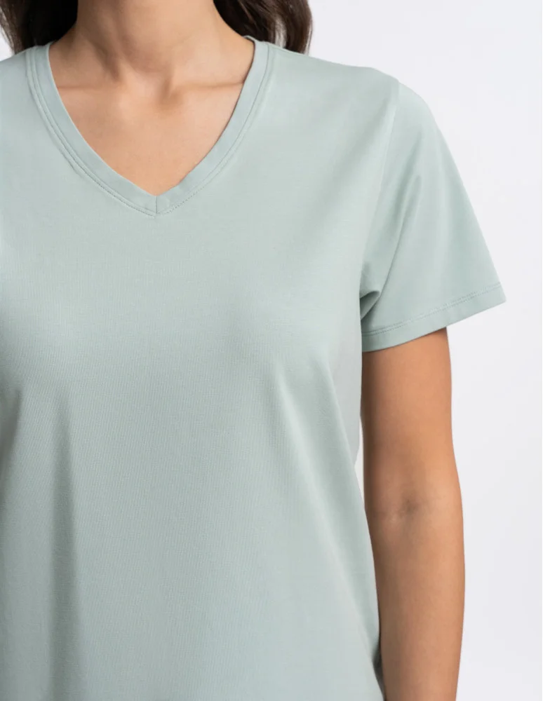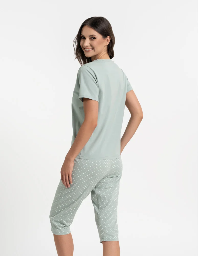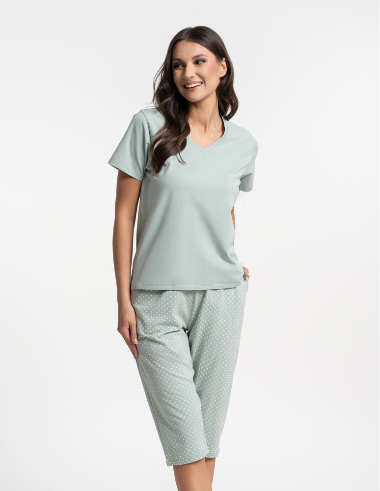 Piżama damska PDD3600-005 stanowi klasyczny model ze spodniami o długości 3/4 zapewniający wygodę i funkcjonalność. Góra piżamy to jednolita, gładka koszulka w kolorze miętowym, dekolt w serek. Do kompletu spodnie wzorowane w kremowe kropezki, w pasie elastyczna guma zapewniająca swobodę ruchów, po bokach wygodne, głębokie kieszenie zwiększające funkcjonalność piżamy która może stanowić komplet całodzienny.