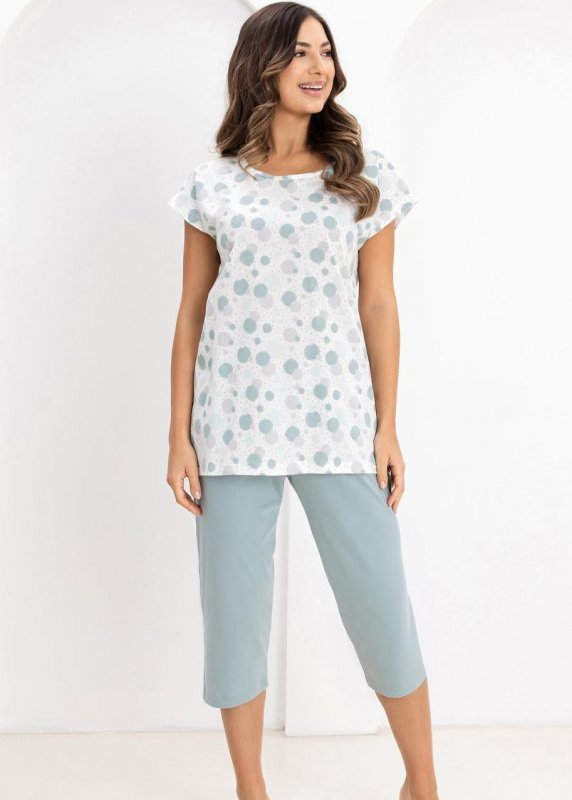 Piżama damska Regina, wykonana z bawełny z krótkim rękawem. Góra piżamy wzorowana, w kolorowe koła, dekolt półokrągły. Spodnie jednolite o długości 3/4 - rybaczki, w pasie elastyczna gumka.