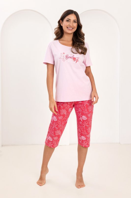 Komfortowa piżama damska Regina, wykonana z miłej w dotyku bawełny. Koszulka z krótkim rękawem w różowym kolorze, ozdobiona nadrukiem, dekolt półokrągły. Spodnie wzorzyste o długości 3/4 z wygodną gumką w pasie.