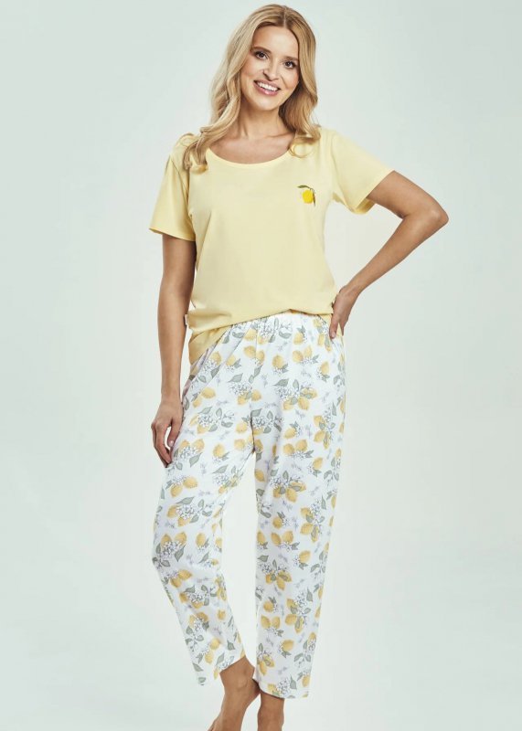 Piżama damska wykonana z bardzo miłej w dotyku bawełny. Bluzka w żółtym kolorze z krótkim rękawem, ozdobiona małym nadrukiem z cytrynką, dekolt półokrągły. Do kompletu spodnie o długości 7/8 z wygodną gumką w pasie, wzorzyste o luźnym, swobodnym kroju.