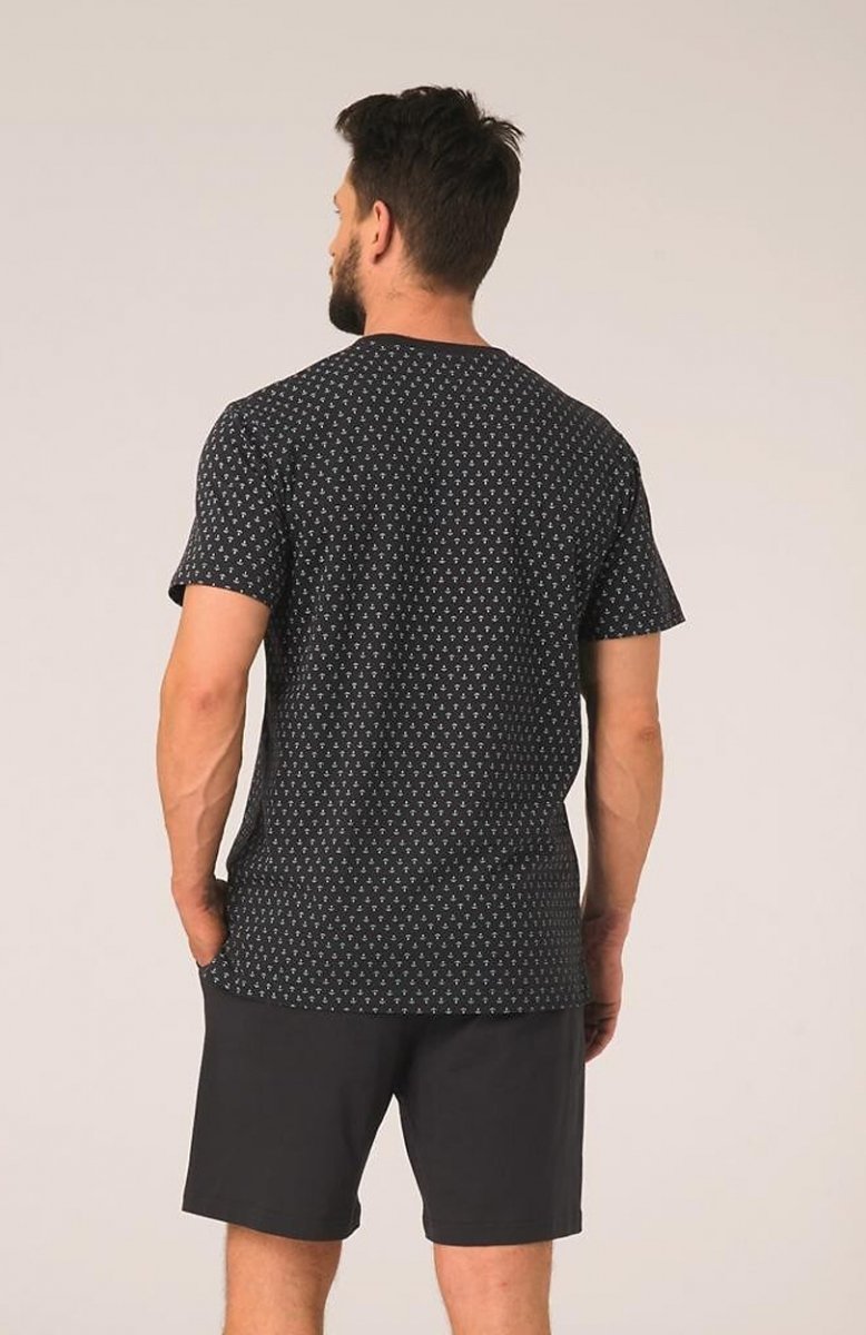 Komfortowa i elegancka piżama męska wykonana z wysokiej jakości miękkiej bawełny. Koszulka z krótkim rękawem, ozdobiona małymi nadrukami w kotwice, dekolt okrągły. Do kompletu krótkie spodenki z kieszonkami. W pasie wygodna gumka i troczki do regulacji.